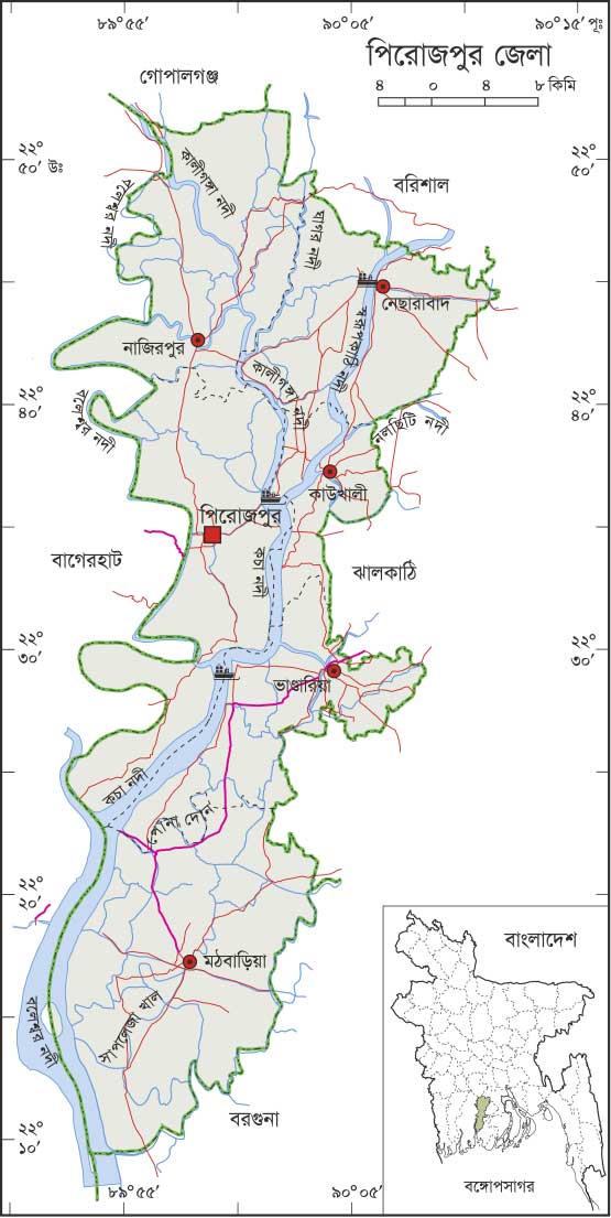 Perojpur is a district in South Western Bangladesh. It is a part of Barisal division. It is located besides the Boleswor river at 22 30° 00° N 89 52° 00° E & 22 52°-00° N 90 13°00° E and bounded by Gopalgonj, Barisal district on the north, Barguna district on the south., Jhalokati district on the east and Bagerhat on the west. It is declared as a district in 1st March, 1984. It consists of Seven Upazila, three Pourasava and fifty one Unions. This district has may beautiful places and is famous for its natural furits like coconut, Guava, Hog-plum, betel leaf and betel nuts etc. The area of the town is small but everything is built in a planned way and also very clean. There are different buses to smooth the communication with other district as well as inside the district. Water routes also connect this district with the capital city, Khulna, Barisal etc all through the year. There are some prominent rivers exists in the districts these are Boleshhwar, Kocha and Sandha etc.