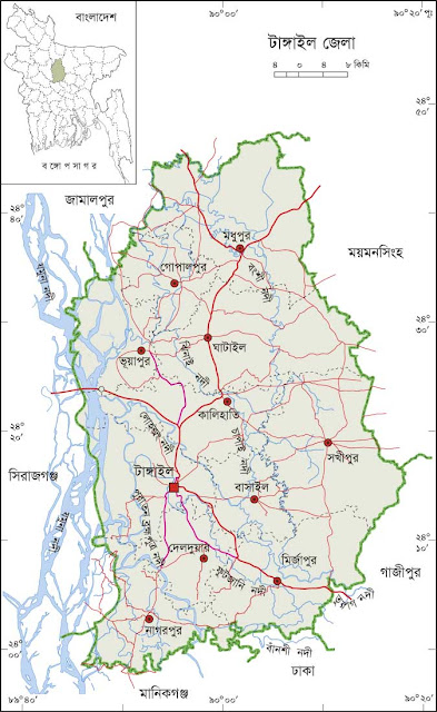 Tangail is a district (zilla) in central region of Bangladesh. It is a part of the Dhaka division. The population of Tangail zilla is about 3508556 and its surface area is 3,375 km2. The main town of Tangail District is the district town Tangail. It is surrounded by the several districts, such as Jamalpur district on the north, the Dhaka and Manikganj districts on the south, the Mymensingh and Gazipur districts on the east, and the Sirajganj district on the west. The main rivers that cross the Tangail district are the Jamuna, Dhaleshwari, Jhenai, Bangshi, Lohajang, Langulia, Elongjani, Jugni, Fotikjani and the Turag.