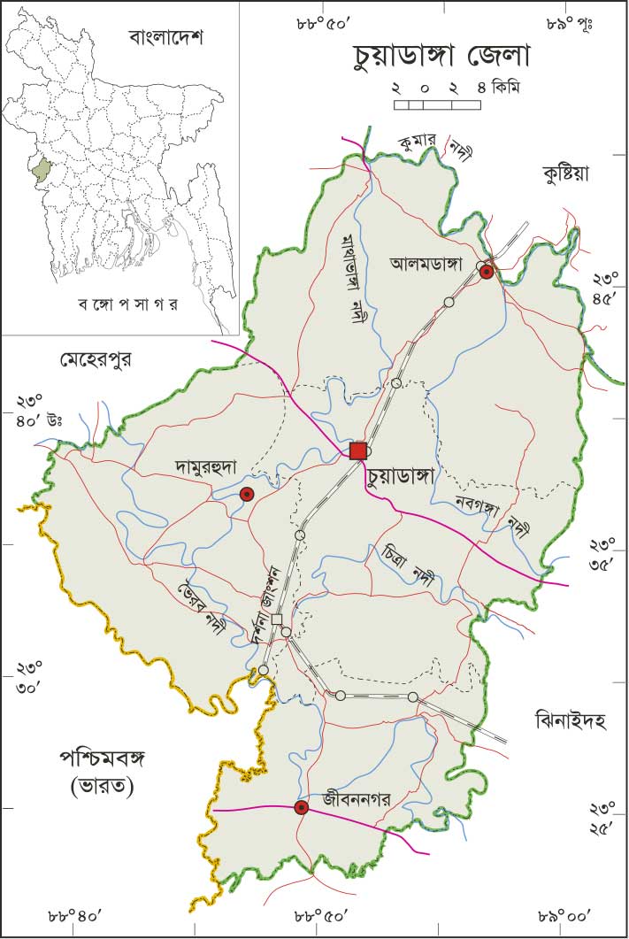 Chuadanga district city stands on the Bank of the Mathabhanga river. It was a sub-division of former greater Kushtia district. It was upgraded to a zila on the 26th February,1984. It consists of four Upazilas, four Pourashavas and thirty-two Union . There are different views about the origin of the name of the Zila. There is a popular view that one Persian businessman named Chua Malik become very prominent in the present area of the zila headquarters. The zila name is believed to have derived from the name of the Persian businessman. The zila is bounded on the north by Kushtia and Meherpur Zilas, on the east and south by Jhenaidah zila and on the west by Meherpur zila and India. The total area of the zila is 1157.42sq km.(446.88 sq miles).The zila lies between 230 22° and 230 50° north latitude and between 88039° and 89000° east longitude. Chuadanga district has a strong history and heritage in diversified culture with indigenous Muslim, Hindus and Christian people. Chuadanga is food surplus area of Bangladesh. Moreover maize, rich, vegetable and mango, betel leaf production are remarkable than other districts. The intercommunication system of the district is enormously developed in the last two decades as a results most of the Unions, Growth centers, rural markets & villages are connected by paved road.
