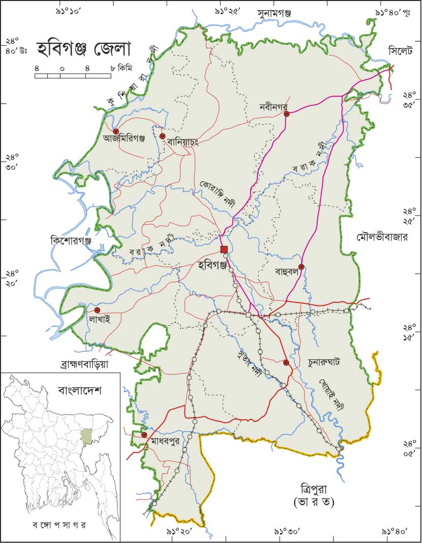 The district headquarters of Habiganj stands on the banks of the Khowai River, located between 23°57'–24°42' N and 91°10'–91°40' E. It was established as a subdivision in 1867. The district comprises nine Upazilas (formerly eight), six Municipalities, and seventy-seven Unions. Habiganj possesses a rich history and a diverse cultural heritage, being home to indigenous communities such as the Manipuri, Tripura, Khasia, Banai, Urang, Telegu, and Bihari people. Historically, the 'Ganj' or bazaar was established on the banks of the Khowai River by Habib Ullah, the son of Syed Hedayet Ullah, the founder of Sultansee Haveli.