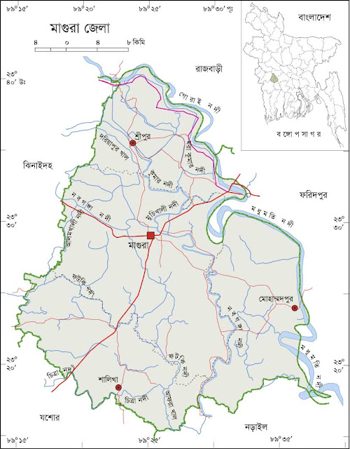 Magura District (Khulna Division) with an area of 1048 km2, is bounded by Rajbari district on the north, Jessore and Narail districts on the south, Faridpur district on the east and Jhenaidaha district on the west. Annual average temperature: maximum 37.1 ℃, minimum 11.2 ℃ annual rainfall 1467 mm. Main rivers are Gorai, Madhumati, Kumar, Nabaganga and Fatki; Ramsagar and Bural Baor are notable.