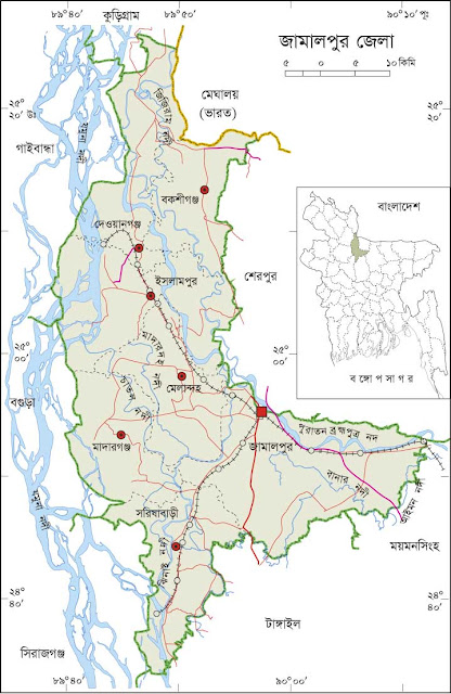 Jamalpur is a district in Dhaka Division, Bangladesh. The city is located on the Brahmaputra River, 140 km (87 mi) north of Dhaka and surrounded by Jamuna & Brahmaputra River . Location coordinates: 24°55'N 89°58'E / 24.92°N 89.96°E The city is connected by road, rail, and river with Dhaka and the rest of the country. It has a railway junction. There is an Asian Biggest Fertilizer Factory at Sarishabari upazila and a sugarcane factory at Dewangonj upazila.Jamalpur is an important market center for the rice, sugarcane, jute, tobacco, and mustard produced in the region. Jamalpur district was established in 1978. The district consists of 7 upazilas, 7 municipalities, 68 union parishads, 57 wards, 224 mahallas and 1532 villages. Archaeological heritage and relics Tomb of Shah Jamal, tomb of Shah Kamal, Dayamoye Mondir, five domed Raspal Jame Mosque at Sarishabari (nineteenth century), Narapara Fort at Sarishabari (sixteenth century). Religious institutions Mosque 3340, temple 47, church 39, tomb 13. Health centres General hospital 01, upazila health complex 06, family welfare centre 39, rail way hospital 2, union health centre 28 and leprosy clinic 7. Cultural organizations Club 139, public library 2, cinema hall 18, stadium 1, public hall 1, upazila auditorium 6, orphanage 448, literary society 4, women's organisation 5, theatre group 6, Shilpakala Academy 1.Communication facilities Roads: pucca 772.67 km, semi pucca 120.55 km, mud road 3374.90 km; railways 108.50 km; waterways 68-nautical-mile (126 km).
