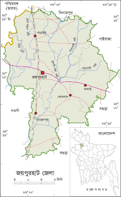 Joypurhat District is in Rajshahi Division & located at 25.10°N 89.10°E. It is bounded by Dinajpur district on the north, Naogoan district on the south, Bogra and Gaibandha districts on the east, Bogra and Naogaon districts and Indian province of West Bengal on the west. Joypurhat was the only subdivision of the erstwhile Bogra district, and since 1984 it has been turned into a district. Santal, Orao, Munda, Mahali, Pahan, Buna, Ho, Mahato, Rajbangshi and Koch are noted tribal of Joypurhat district. This district has a glorious contribution in Anti-British Swadeshi Movement. During the Anti-British Swadeshi Movement there was an abortive bomb attack on a train under the leadership of Comrade Abdul Kader Chowdhury and Mihir Mukherjee, later they were captured and deported to the Andaman. Health care facilities are very good in Joypurhat district. There are one Modern district hospital, one Diabetic hospital, five Upazila health complex, thirteen Union health centre, one Red Crescent health centre, five Private clinic, one Veterinary hospital & five Upazila veterinary care centre. There are a Sugar mill, a Cement factory, Textile mill, Rice mill, Flour mill & also some cottage industries in this district. There is a large deposit of lime stone under this district. The main crops are Paddy, Potato, Jute and Sugarcane. Different types of fruits are also available here. Main rivers are Little Jamuna, Tulsi Ganga and Haraboti. Annual average temperature: maximum 34.6℃, minimum 11.9℃ annual rainfall is 1610 mm.