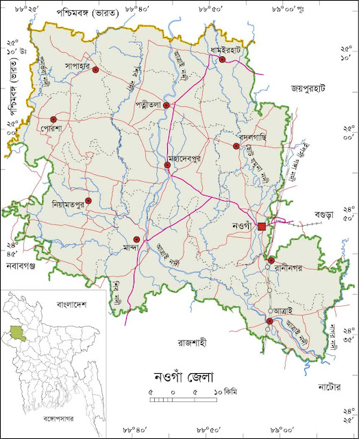 The district town Naogaon is bifurcated by the river little Jamuna, a branch river Atrai. The town located at 24.90°N 88.75 °E. Naogaon district was one of the Sub-divisions of former Rajshahi district of Bangladesh. Naogaon, a part of greater Rajshahi district was upgraded to Zila 1st March of 1984. It is bounded on the north by India, on the East by Bogra and Joypurhat districts, on the south by Rajshahi and Natore districts and on the west by Chapai Nawabganj district and India. The naming of the district town is a peculiar history. It is believed that the name "Naogon" was named after the two words "Nao" and "Gaon". In Bengali Nao means new and Gaon means village. So Naogaon is believed to be comprised of the then nine new villages. The district people are well known for their roles in the war of Liberation. Shahid Major Najmul Haque was appointed as the Wing Commander of No. 7 East Pakistan Rifles (EPR) wing at Naogaon Mahokuma at the beginning of March of 1971. He declared Naogaon as of a part of Independent Bangla and organized a battalion comprising with soldiers of EPR and volunteers. As the commander of that battalion, he took position at military camp at Bogra city after defeating Pakistan soldiers. Noted institutions: Naogaon K.D High School (1884),Naogaon Zila School(1917), Raja Haranath High School (1990), Kaligram Rabindranath Institute (1910), ChakAthita High School(1914), Chakla High School (1916), Kritipur High School (1921), Sharbamanal High School (1921), Paramohan Girl's High School (1909), Central Girl's High School (1926), Naogaon Girl's High School (1948), Basiruddin Memorial Co operative College (1946). Annual temperature: maximum 37.8℃ and minimum 11.2℃ annual rainfall 1862 mm.