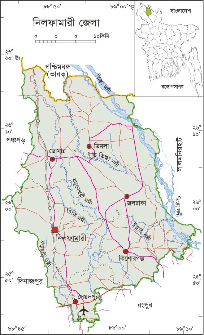 Nilphamari district city stands on the bank of the Tista river and Located at 25.950 N & 86.950 E.It is declared as a district in 16th June 1984. It consists of Six upazilas, four Pourashavas (Muncipiality) and 60 (Sixty) Unions. The Nilphamari Municipality was established in 1972. The district is adjacent to Indian Asam Border. It is renowned for some of the tourist resorts like Nil-Sagor, Tista Baradge, Uttara EPZ, and Abasar Rest house, Nilphamari is agriculture famous area moreover, Nazir-Shail and Paizam rice production are remarkable than other districts of Bangladesh. The intercommunication system of the district is enormously developed in last three decades as a result most of the village are jeepable except a few exceptions. There are some prominent rivers exists in this district. These are Tista, Charalkata, Burikhora,, Nowtara & Ichahmoti.