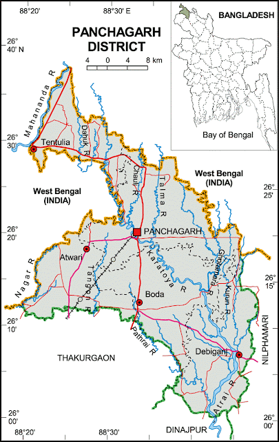 The existences of five garhs are Bhitargarh, Hosaingarh, Mirgarh, Rajangarh and Devengarh. Panchagarh is named after these five garhs. Panchagarh District City stands on the bank of Kartoya at once 26.250N 88.500 E. The Panchagarh District in the northern part of Bangladesh. In the boundary on three side's by 288 km long India Border, having Darjeeling District North, Jalpaiguri and Kuchbihar Districts on the northeast, west Dinajpur and Purneia District on the west, Dinajpur and Thakurgaon Districts on the south, Nilphamari District on the east.Panchagarh was a thana under Jalpaiguri district of West Bengal during the British rule. It was under Dinajpur district at the time of the partition of 1947. It was turned into a subdivision in 1980 consisting of Panchagarh Sadar, Boda, Debiganj, Atwari and Tetulia thanas. Panchagarh was elevated to a district in 01th February 1984. It consists of five upazilas, two municipality, 43 union Parishads and 850 villages.Panchagarh has a strong history and heritage in diversified culture within indigenous Sautal (Tribal) people's. During separation of India in 1947, Panchagarh thana was attached with Dinajpur District under Thakurgaon Mohakuma. In the Mohakoma Administrator Mr. Sayed Abdur Rashid (01-01-1980 to 31-12-1982). The Panchagarh Municipality was established in 1985. Panchagarh Sugar Mills was set up by the Government in 1965-69. It is the northern most Sugar Mill in Bangladesh. The Sugar Mill started its trail production in 1969-70. The first Rocks Museum in Panchagarh was established in 2000. The Panchagarh BP Government High School, Panchagarh and Primary Teacher Training Institute (PTI) were established in 1944 & 2006-07 respectively. Panchagarh Bir Moktijoddha Sirajul Islam stadium near in the Head Quarter. It’s soil is sandy, alluvial and bears close affinity with the soil of the old Himalayan Basin. On the northern part of the district there exists under ground water layer problem. Panchagarh has 16 rivers. Among them some main rivers are Kartoya, Atrai, Tista, Nagor, Mahananda, Tangon, Dahuk, Pathraj, Bhulli, Talma, Chawai, Kurum, Versa, Tirnoi, and Chilka. Maximum riverbed characters is steep slope. There are many Industries such as Tea Estate & Industry, Sugar Mill, Gem Jute Mill, Rice Mill, Ice Factory, Oil mill and Sawmill.