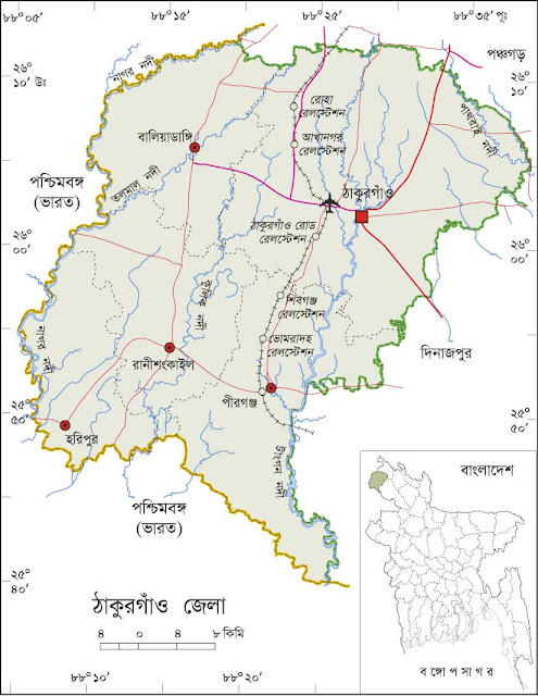 Thakurgaon district city stand on the bank of the Tangon river and located at 25º40' - 26º10' North and 88º36' East. It was established as a Sub Division 1860. It is declared as a district 1st Febrary 1984. It consist of five upazillas, three Pourshavas and fifty one unions. Adminstrative work Start at 1860. Thakurgaon pouroshava was established in 1958. It is renouned for some of the tourist resorts like Ranisagor dighi, Jamidarbari at Ranisankail Upazila, Fun city at Pirganj Upazila , Harinmari mangoo tree at Baliadangi Upazila, Jamidarbari at Haripur Upazila.The District adjacent to Indian Border.